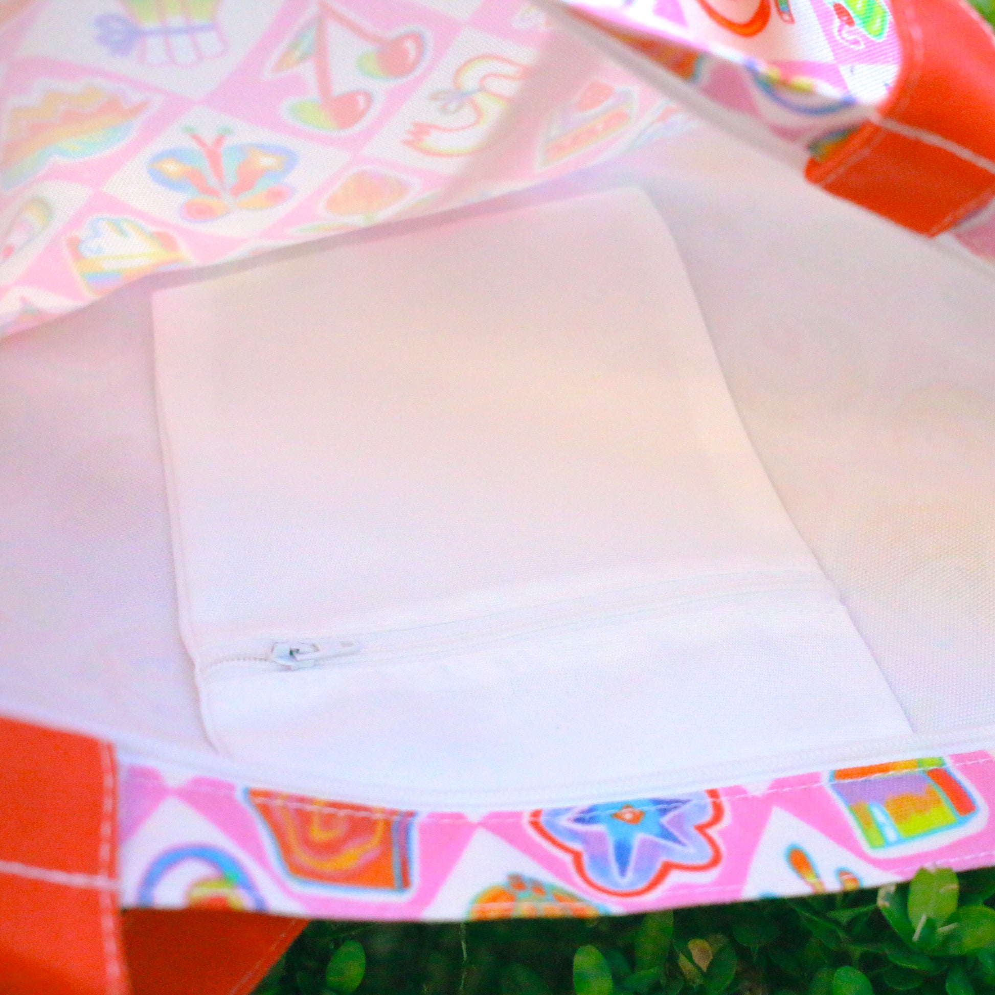 35x45cm tote bag with a 33cm strap! Includes a zipper and a interior pocket!