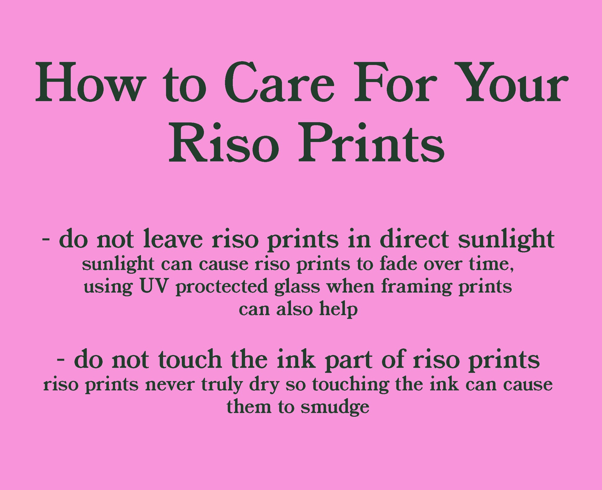 Printed on 80lb paper. Colors may differ slightly from the photo. Make sure to read the third photo to learn about how to care for risograph prints!