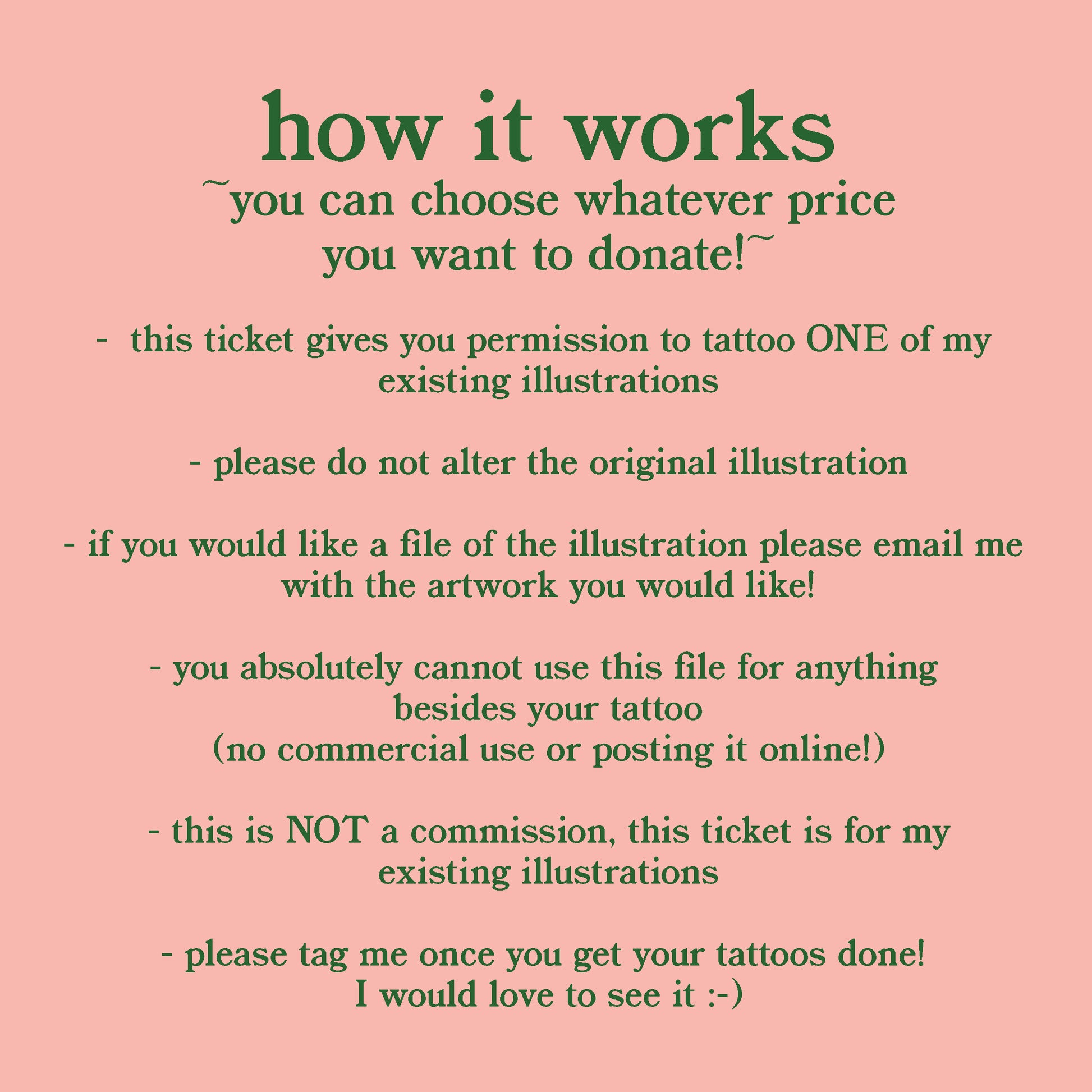 - you absolutely cannot use this file for anything besides your tattoo (no commercial use or posting it online!) - this is NOT a commission, this ticket is for my existing illustrations - please tag me once you get your tattoos done! I would love to see it :-)
